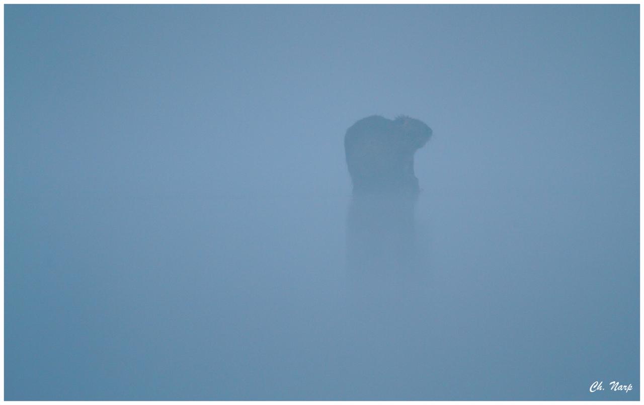 Ragondin dans le brouillard matinal